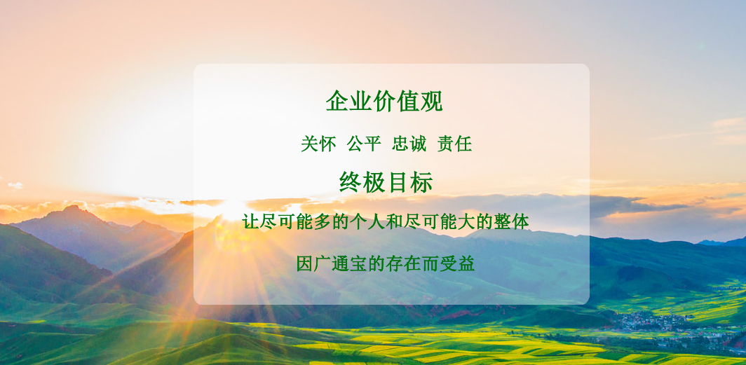 秉承“关怀、公平、忠诚、责任”的价值观和“让尽可能多的个人和尽可能大的整体因广通的存在而受益”的终极目标,我们将致力于人类食品、医药健康事业并诚挚欢迎国内外朋友、企业建立广泛的经济、技术交流与合作,共同缔造更加健康、和谐、美好的明天。