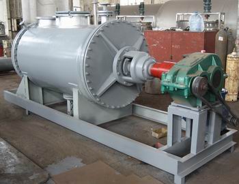 | 【真空耙式干燥機】 具有結構簡單,操作方便,使用周期長,性能穩定可靠,蒸汽耗量小,適用性能強,產品質量好,特別適用于不耐高溫、易燃、調溫下易氧化的膏狀物料的干燥,該機經用戶長期使用證明是一良好的干燥設備。原理:被干燥物料從殼體上方正中間加入,在不斷正反轉動的耙齒的攪拌下,物料軸向來回走動,與殼體內壁接觸的表面不斷更新,受到蒸汽的間接加熱,耙齒的均勻攪拌,粉碎棒的粉碎,使物料表面水分更有利的排出,氣化的水分經干式除塵器、濕式除塵器、冷凝器,從真空泵出口處放空。結構:真空耙式干燥機的主要部件 |
